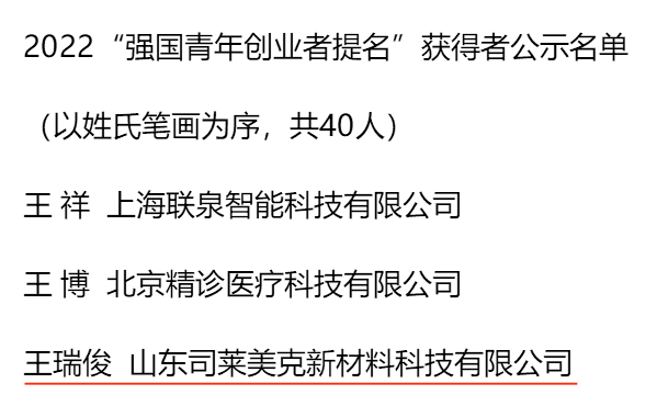 9月28日,在2022“智创未来”强国青年创业者寻访活动中,我校博士研究生、山东司莱美克新材料科技有限公司总经理王瑞俊获“强国青年创业者提名奖”。