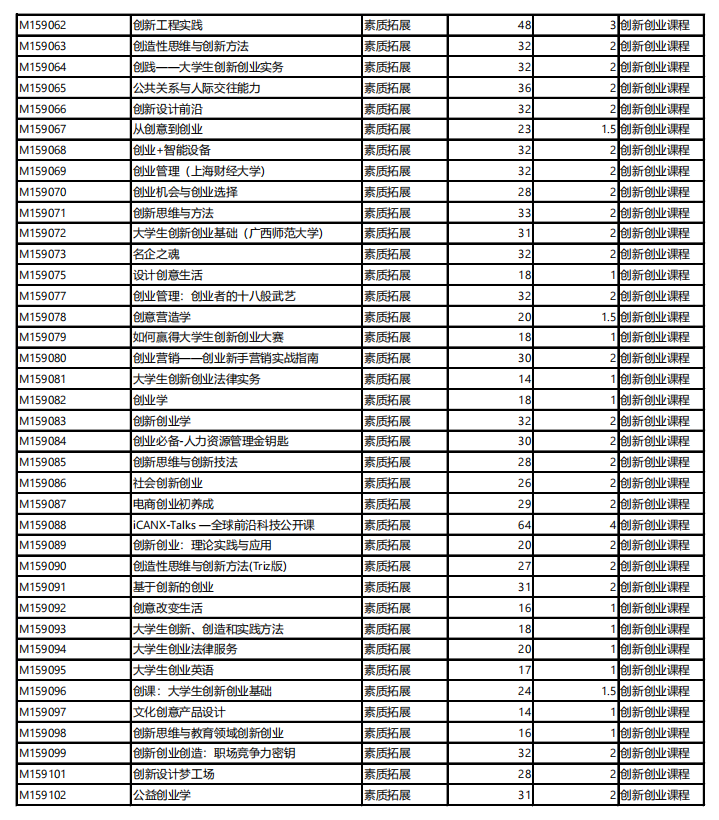 请同学们登录我校选课系统进行选课(),可通过“课堂要求”的说明提前观看课程视频了解课程信息(不计入课程学习进度),9月22日晚20:00选课截止。人文素质类、创新创业类在线公选课程位于素质拓展课类选课栏下,居于页面偏下位置,课程编号以M开头,课程类别为人文素质类(M289038-M289081)、创新创业类课程(M159062-M159102)。
