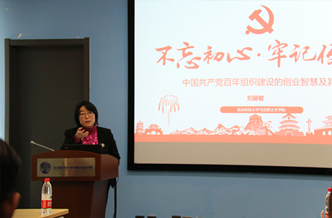 刘丽敏以“中国共产党百年组织建设的创业智慧及启示”进行了报告。她首先剖析了“不忘初心,牢记使命”这八个字,以建党百年主题MV为例,指出无论在建党还是创业过程中,都应永怀赤子之心;她提到自己在大年三十收到的“跟党学创业”小组课题报告时的欣喜与感动。