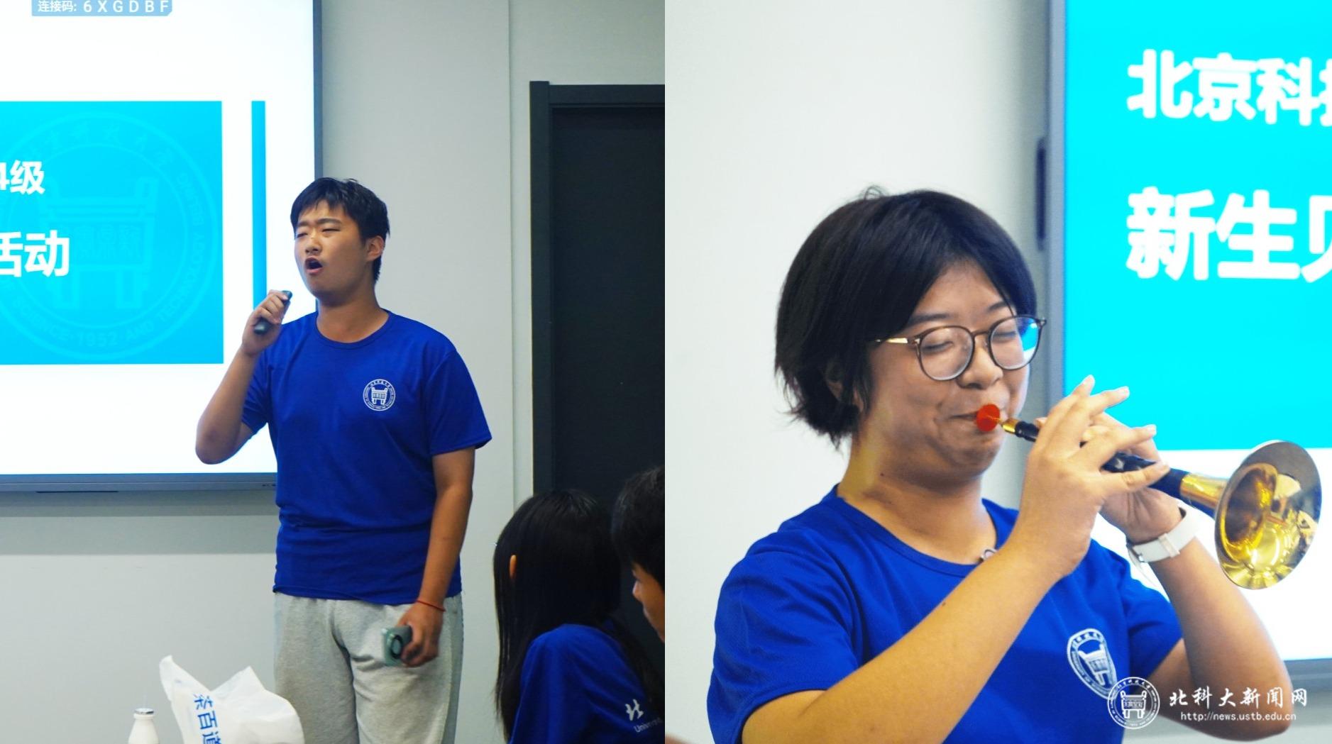 随后的中秋联欢活动中,新生代表司东平献唱《海阔天空》,唱出了同学们对未来的期待和向往。新生代表王郇带来唢呐独奏,吹响学校原创音乐——《鎏金》,带同学们感悟老一辈北科人的钢筋铁骨。
